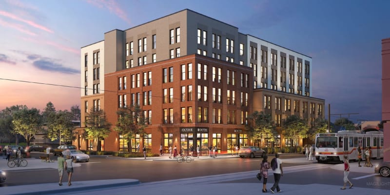 Located on the edges of the Baker and Washington Park neighborhoods, a transit-oriented development project known as Denizen was built on a former Park-n-Ride lot and bus turnaround at Alameda Station.
