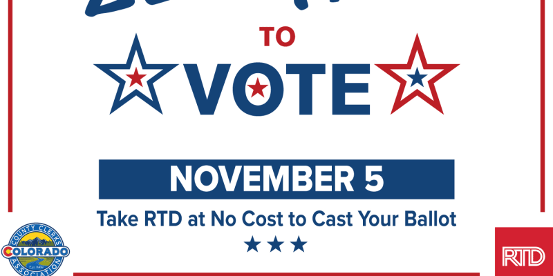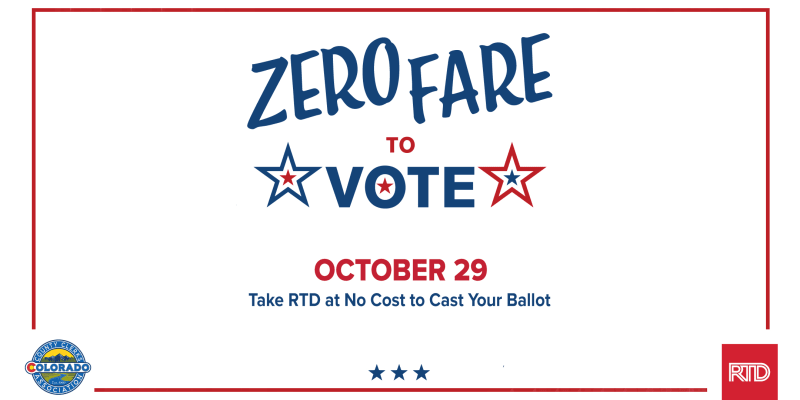 News Release25 October 2024RTD, Colorado Secretary of State and county clerks encourage customers to ride transit at no cost and vote on two Zero Fare to Vote days