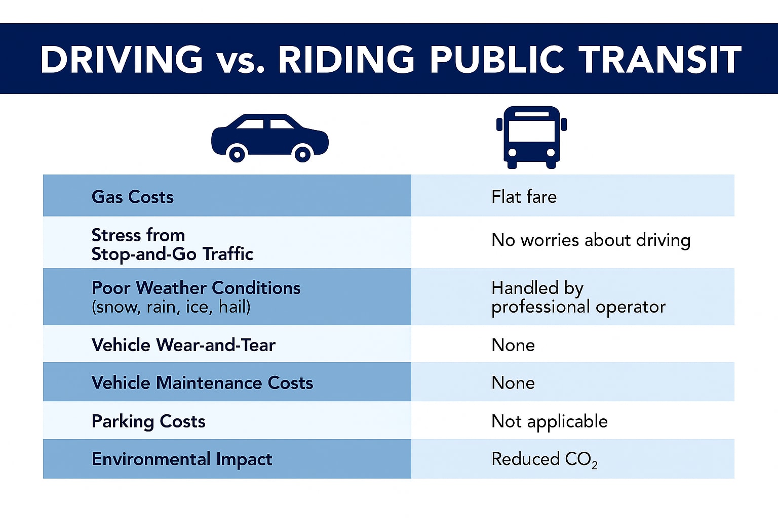 The break-even point of taking transit is 40 miles of round-trip travel – all else remaining the same – but not accounting for vehicle maintenance, parking costs, the stress of driving in poor weather conditions, or the emotional and mental toll of time spent in stop-and-go, congested driving situations.