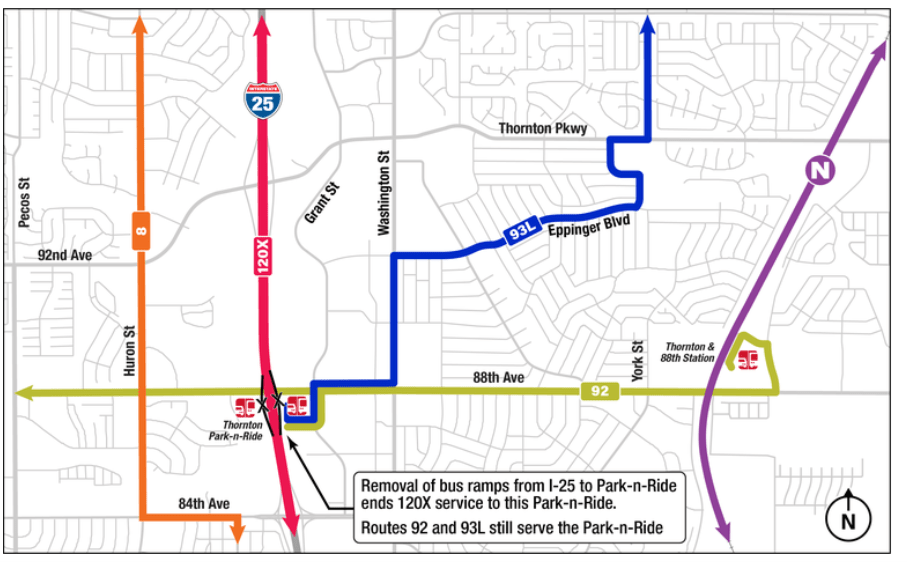 The proposed actions include removal of bus ramps from I-25 to the Thornton Park-n-Ride, which would necessitate discontinuance of RTD Bus Route 120X service to this Park-n-Ride.