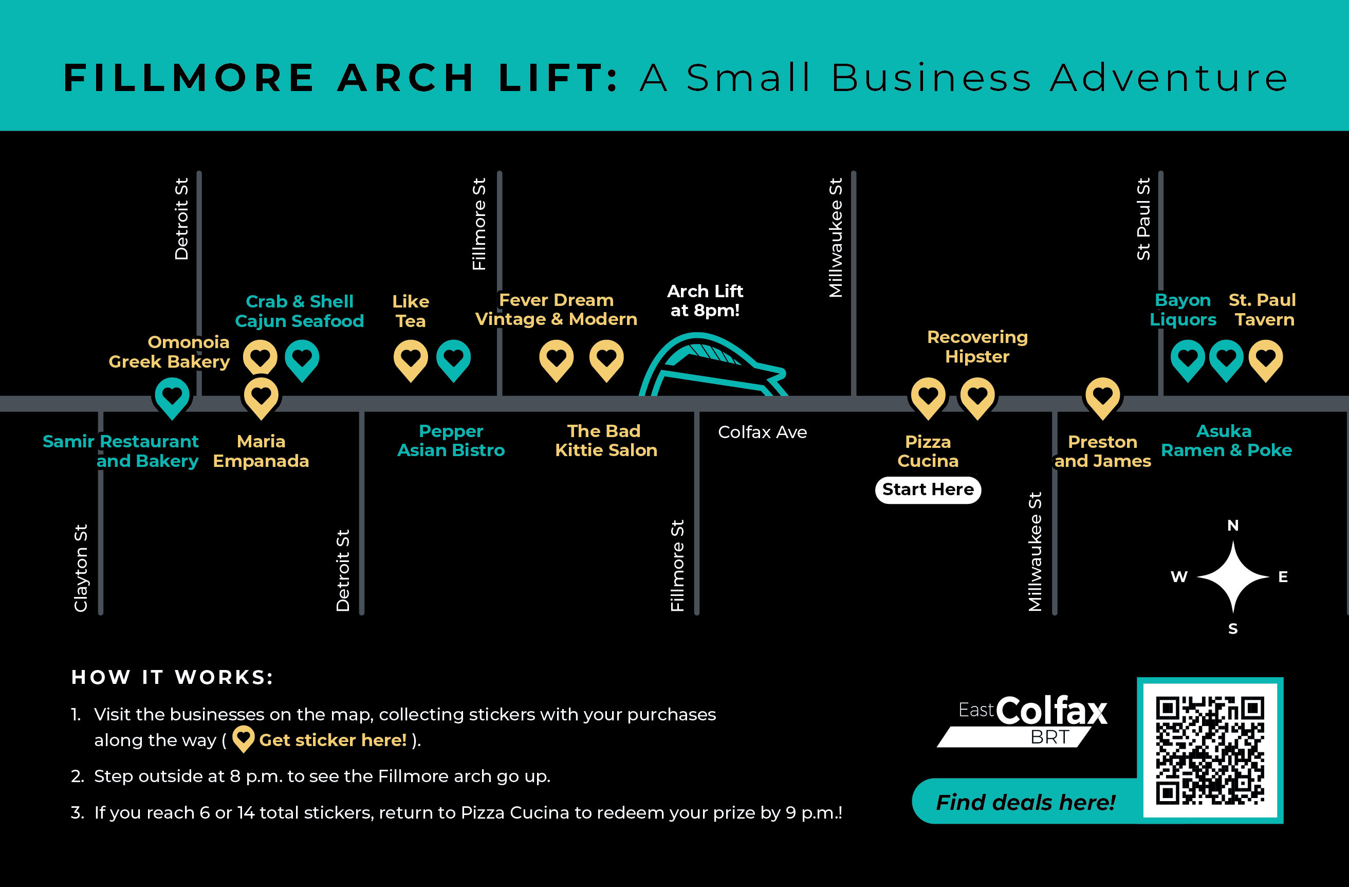Get ready for a new kind of arch lift viewing experience! On Monday, March 2, crews will raise the next BRT station arch at Fillmore Street. RTD, the City and County of Denver, and We Back the Fax partners are excited to invite the community to a Colfax small business adventure with exclusive deals — some for one night only!