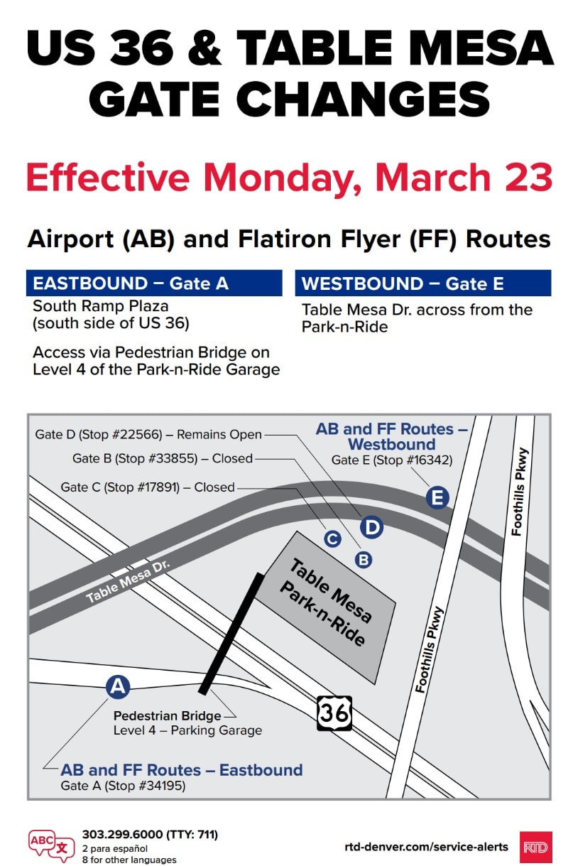 DENVER (March 12, 2026) –– The Regional Transportation District (RTD) will begin work March 23 to perform structural repairs at the Table Mesa Park-n-Ride. To ensure customer safety, the 18-month project will require temporary closure of the station plaza area and relocation of some bus gates.