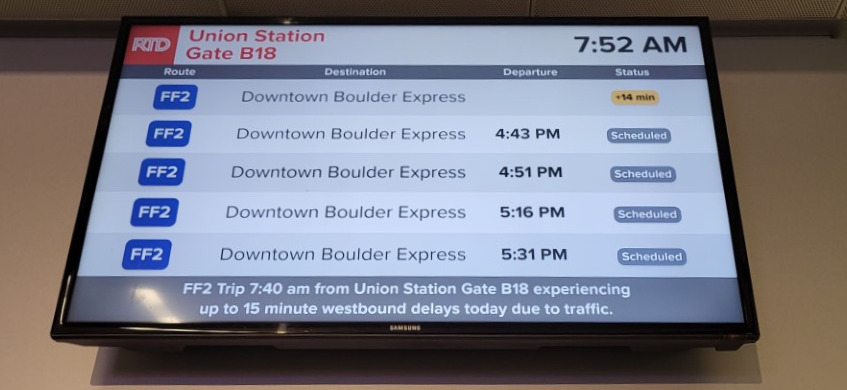 De nouveaux affichages numériques sont désormais en place dans les Denver Union Station, RTD entame une modernisation de la signalisation numérique à l'échelle du système afin d'améliorer l'accès des clients aux informations en temps réel sur les itinéraires, les destinations, les heures de départ et les mises à jour des services. Lire la suite.
