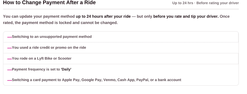 - Vous pouvez mettre à jour votre mode de paiement jusqu'à 24 heures après votre course.