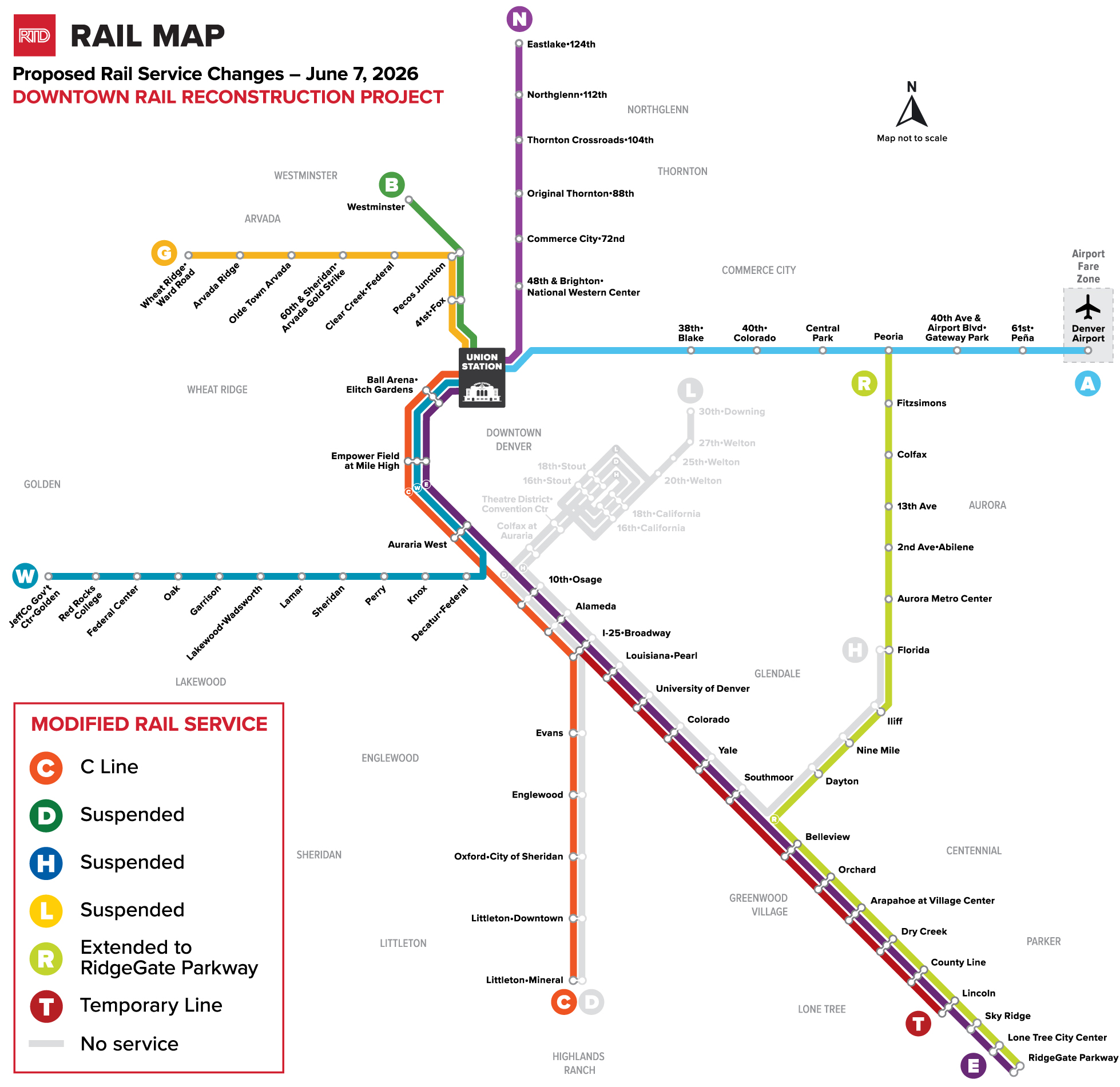 Changements de service proposés par RTD pour juin 2026 visent à améliorer l'expérience des clients, à faire progresser la Plan d'optimisation du systèmeet de soutenir les phases finales de la Projet de reconstruction des voies ferrées du centre-ville. Les mises à jour visent à améliorer la fiabilité et la ponctualité des bus et des trains en fonction des réactions de la communauté, des schémas de déplacement, des tendances de fréquentation, de la demande saisonnière, des facteurs économiques et des ressources disponibles.