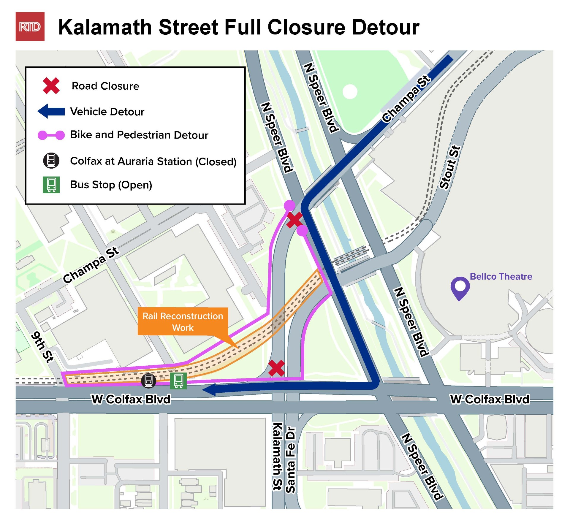 또한, 9월 9일 화요일과 9월 10일 수요일에 덴버 교통 및 인프라부(DOTI)와 협력하여 철거 제한을 확정하고 교통 및 기차 신호 장비를 재검토하는 작업이 진행되었습니다. 칼라매스 스트리트와 아우라리아 역 콜팩스 인근의 보도는 9월 15일(월)까지 계속 개방됩니다. 그 이후에는 보행자 우회가 시작됩니다.