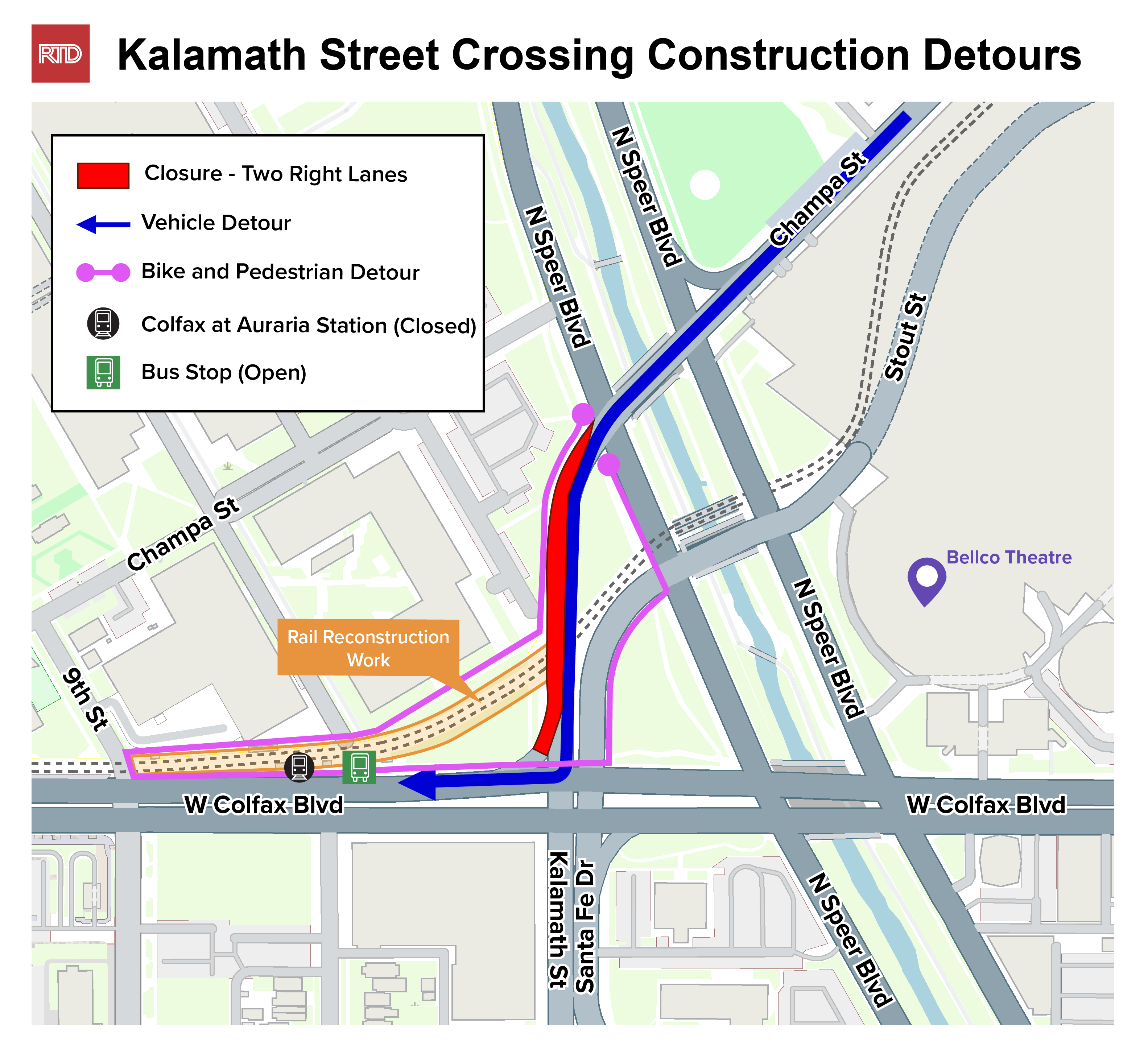 - Double, left-lane closure on southbound Kalamath Street between Speer and Colfax. This switch will allow crews to complete removal of ballast on the east side of Kalamath.