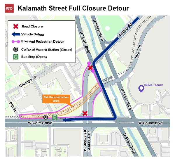 - October 19-26, crews will reconstruct the rail on southbound Kalamath Street. This will require a full closure of southbound Kalamath lasting approximately one week. Details on the closure and detour routes will be distributed ahead of time.