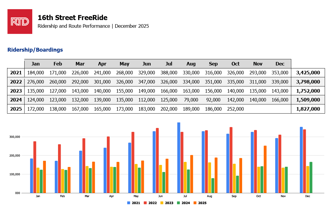 ДЕНВЕР (23 декабря 2025 г.) - The Региональный транспортный округ (RTD) 16-я улица Фрирайд В первый полный месяц после открытия коридора число пассажиров значительно возросло, что свидетельствует о возобновлении мобильности и оживлении центра города.