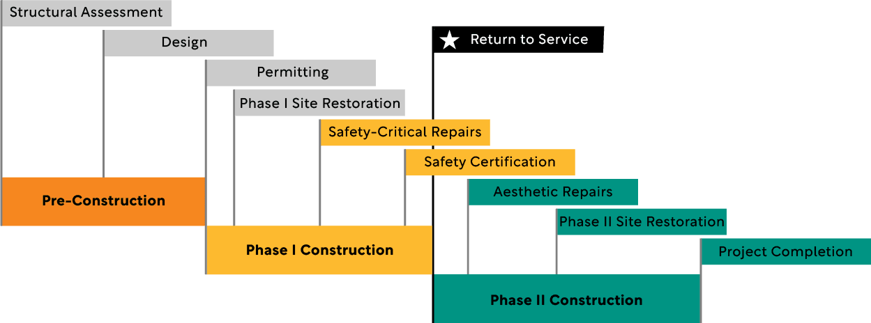 The timeline above provides a breakdown of the phases for repair work and the milestones crews are working towards in each phase. Milestones shown in in grey are complete.