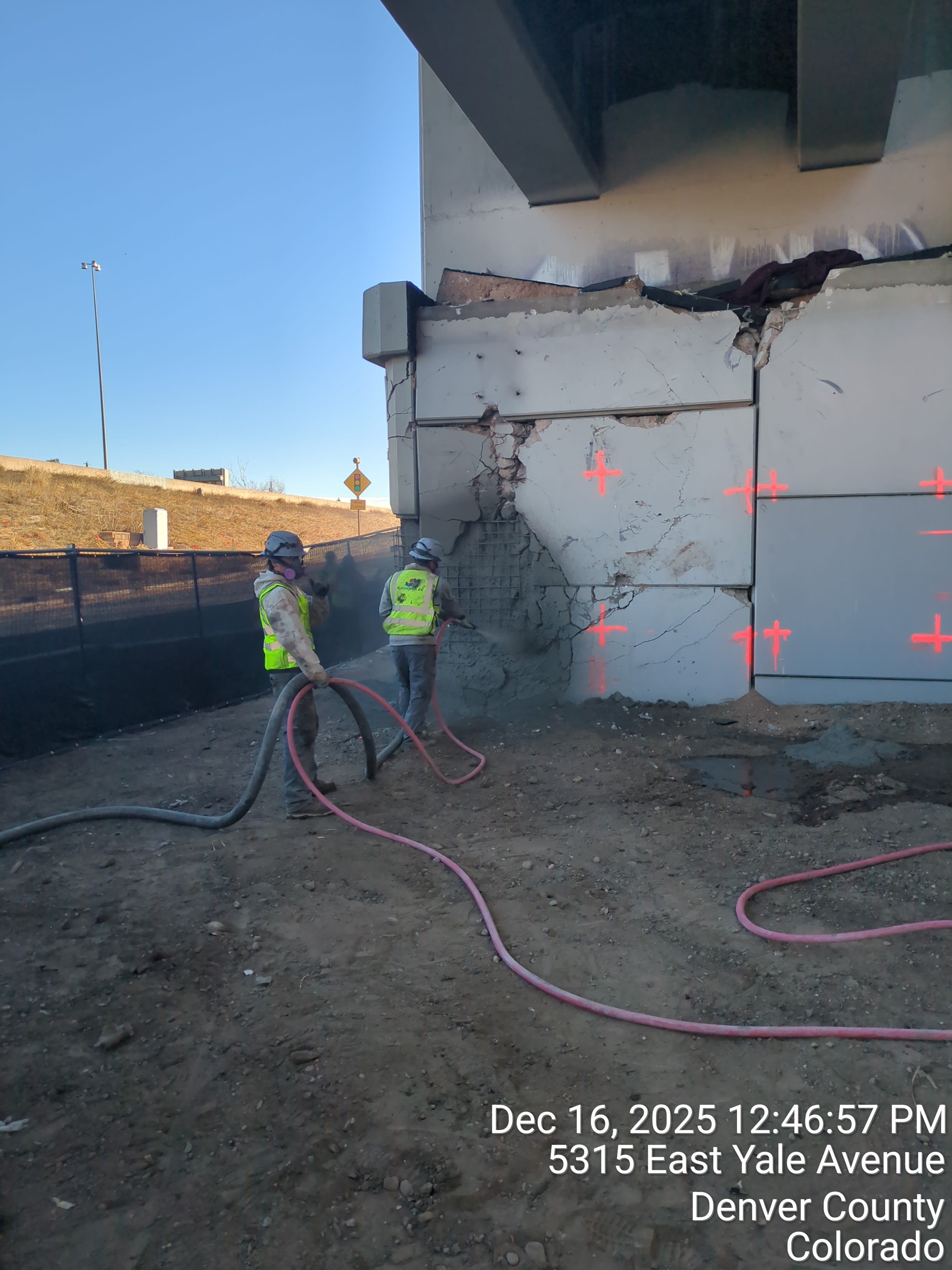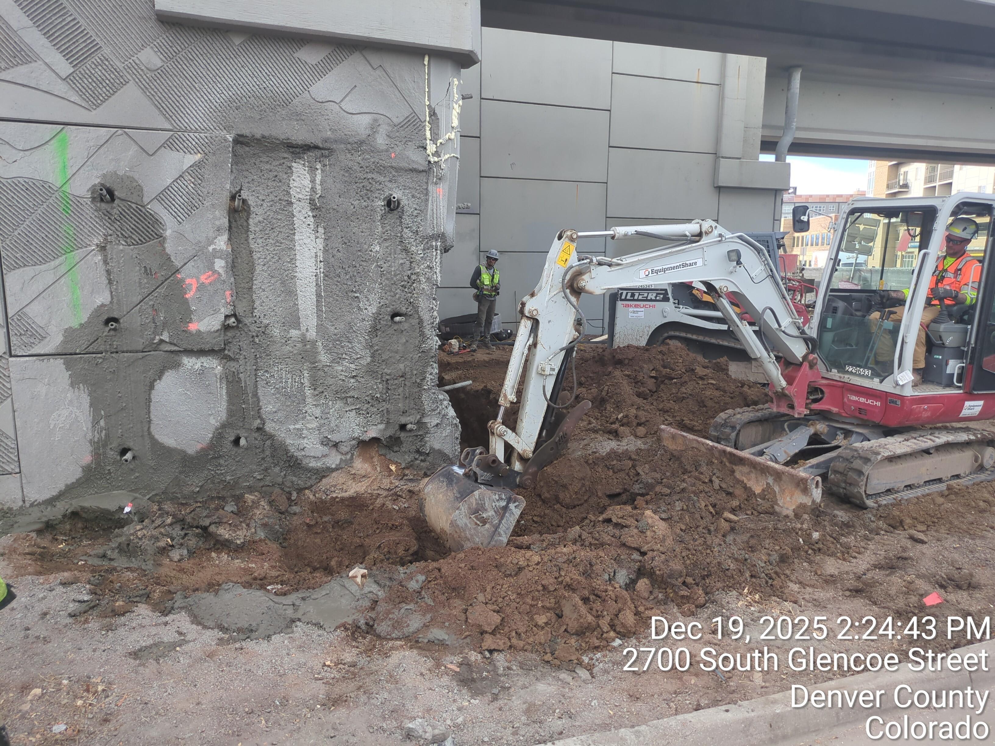 The Regional Transportation District (RTD) is working to complete emergency repairs to the Yale Street light rail bridge abutment after a fuel tanker crashed into the structure on Thanksgiving day. The non-RTD crash damaged the bridge’s mechanically stabilized earth (MSE) wall and is impacting E and H line service. After safety-critical repairs have been made, the bridge will be fully inspected. Non-critical aesthetic work to the bridge will start after light rail service has resumed on both sets of track.