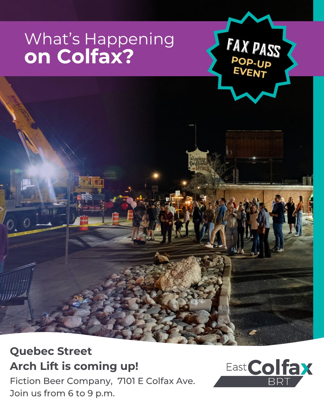 - 7:30 p.m. - Destination Colfax: 纪录片预告片:下个月,丹佛市和县及其合作伙伴将推出一部纪录片,展示科尔法克斯大道的传奇历史和演变过程:"目的地科尔法"。请在此次派对上观看预告片,并将首映日期定在以下日期 奥罗拉福克斯艺术中心 5 月 1 日下午 6 时!