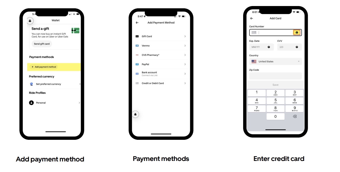 申请乘车前必须在账户中输入个人付款方式(借记卡、信用卡、PayPal 等)。