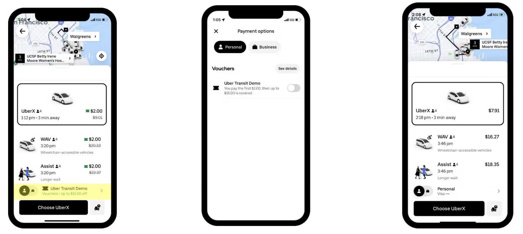 选择乘车类型:查看删除线价格,确认优惠券已激活。